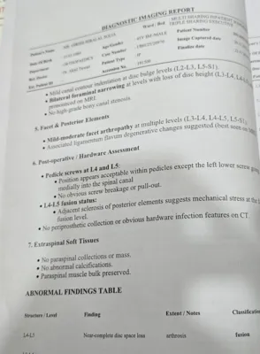 Recent diagnostic imaging shows advanced degeneration in his lumbar spine, including near-complete loss of disc height at L4–L5, degenerative disc disease at L3–L4, and multiple bone spurs from L2 to L5. There are also signs of early spinal ankylosis and alignment issues likely caused by chronic muscle spasm. Post-surgical hardware is present in the spine, indicating the complexity of his medical history. These findings explain the continuous pain, reduced mobility, and discomfort he endures every day.