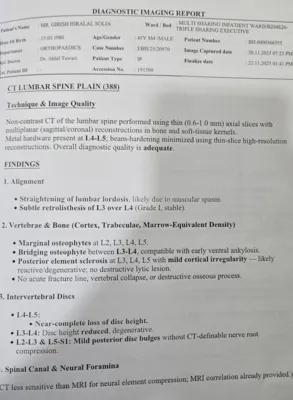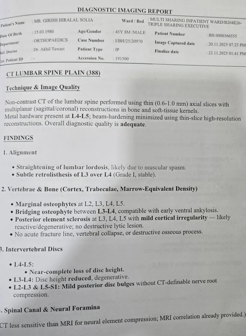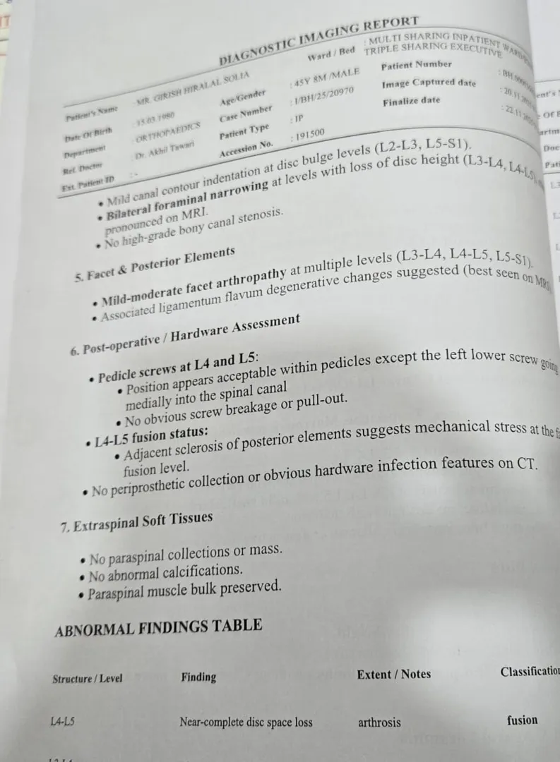 Because of the severity of his condition and the history of multiple surgeries, my father now requires ongoing orthopedic and spine specialist care, regular investigations, pain management, rehabilitation, and long-term physiotherapy. There is also a possibility of further medical or surgical intervention in the future. The cost of continued treatment, hospital visits, diagnostic tests, medicines, and rehabilitation has placed an enormous financial strain on our family.